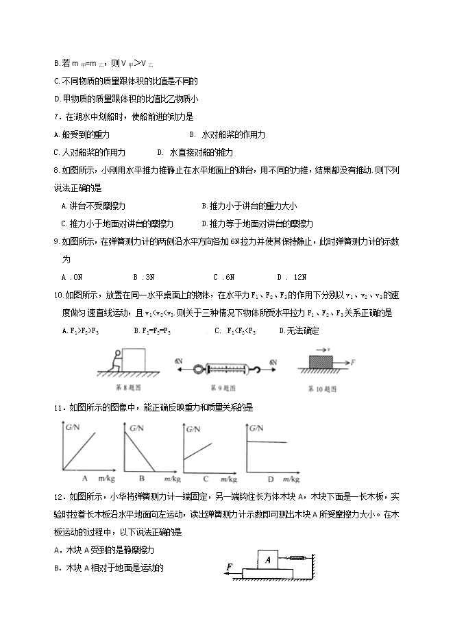 9.如图所示,在弹簧测力计的两侧沿水平方向各加6N拉力并使其保持静止,此时弹簧测力计的示数为
