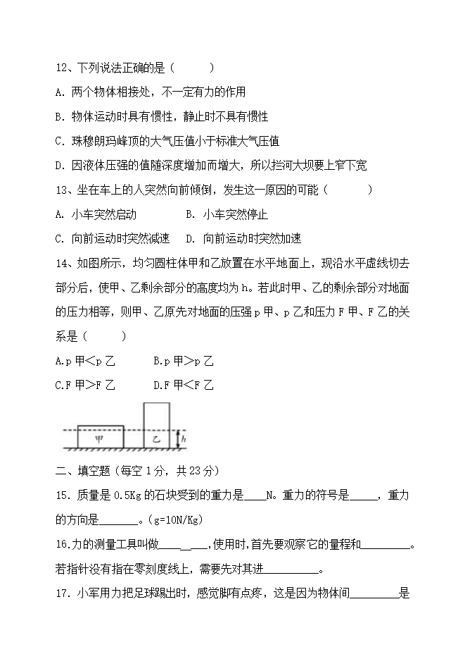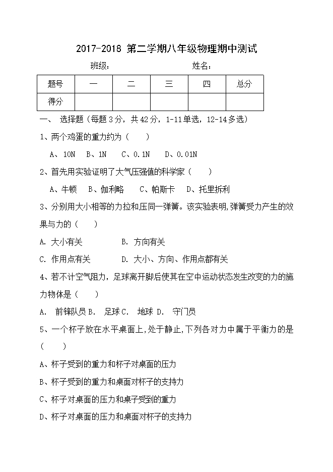 河北省青龙满族自治县祖山兰亭中学2017-2018学年八年级下学期期中考试物理试题(无答案)