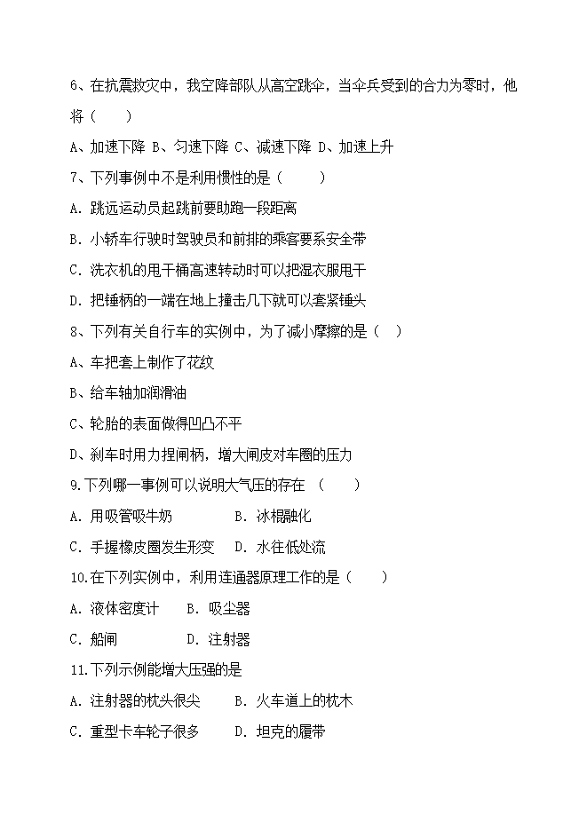 6、在抗震救灾中,我空降部队从高空跳伞,当伞兵受到的合力为零时,他将( )