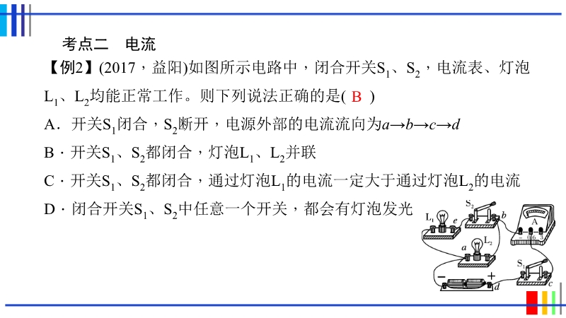 【内容简介】2018年中考物理专题课件:《第16章 电路、电流》PPT,课件有38张幻灯片,课件第一个环节是考例精析,根据考点展示中考试题,通过例题的分析,总结知识点和解题的方法,提高知识的运用能力。第二环节是实验突破,再现教材实验,回顾实验的设计方案,同时对实验进行拓展延伸;最后环节是备考集训,本环节主要是展示中考试题,分为基础题和提高题,课件设计科学合理。