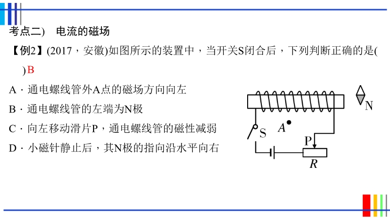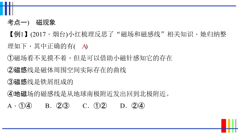 【内容简介】2018年中考物理专题课件:《第22章 电与磁》PPT,课件有52张幻灯片,课件第一个环节是考例精析,根据考点展示中考试题,通过例题的分析,总结知识点和解题的方法,提高知识的运用能力。第二环节是实验突破,再现教材实验,回顾实验的设计方案,同时对实验进行拓展延伸;最后环节是备考集训,本环节主要是展示中考试题,分为基础题和提高题,课件设计科学合理。