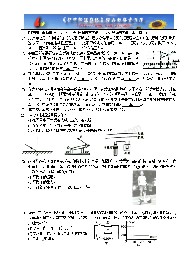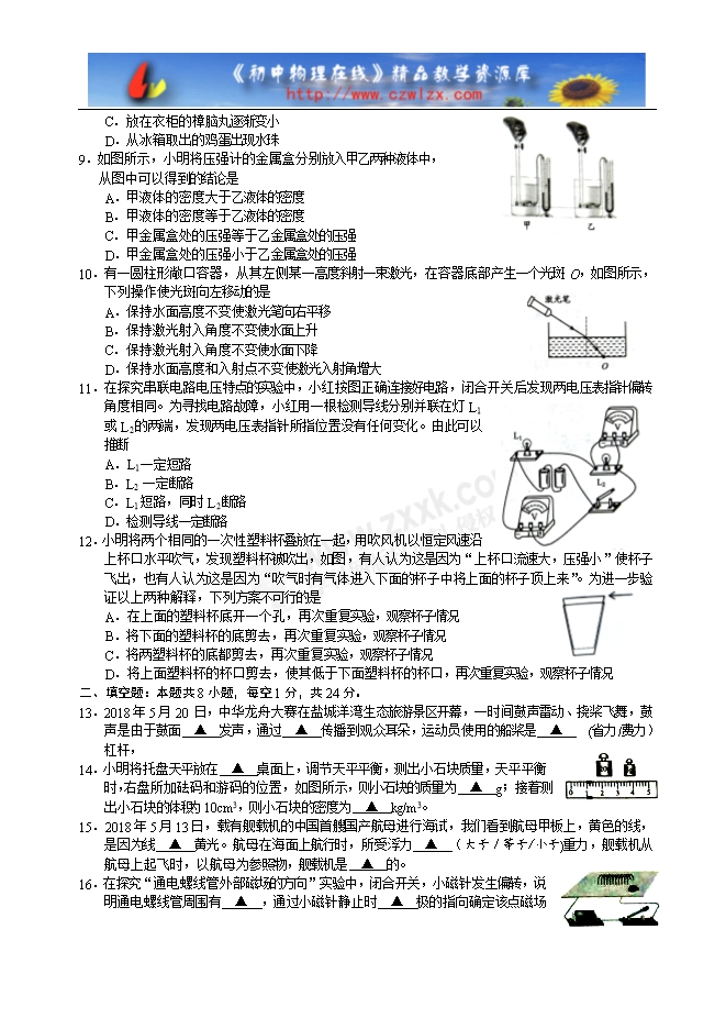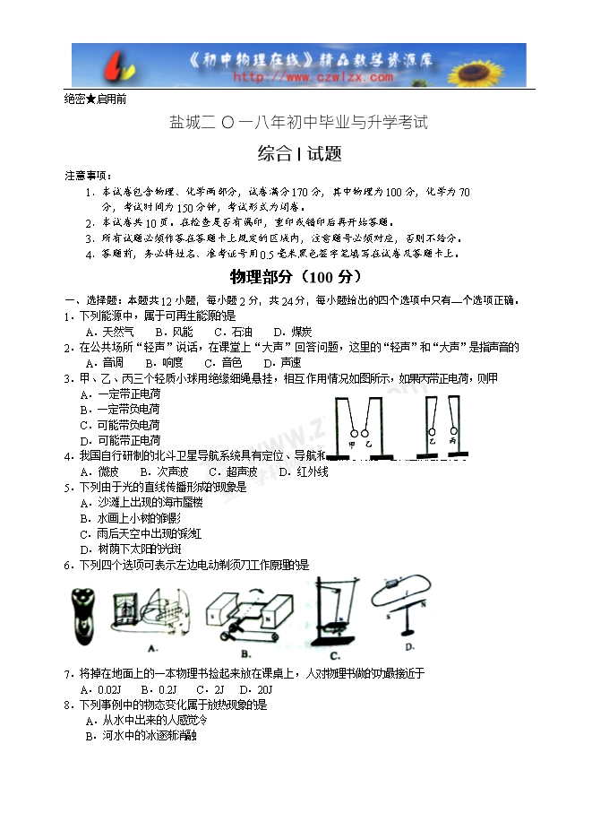 江苏省盐城市2018年中考物理试题(word版,含答案)