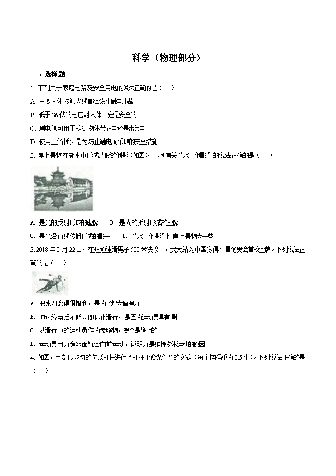 3. 2018年2月22日,在短道速滑男子500米决赛中,武大靖为中国赢得平昌冬奥会首枚金牌。下列说法正确的是( )