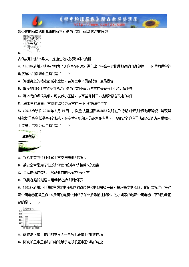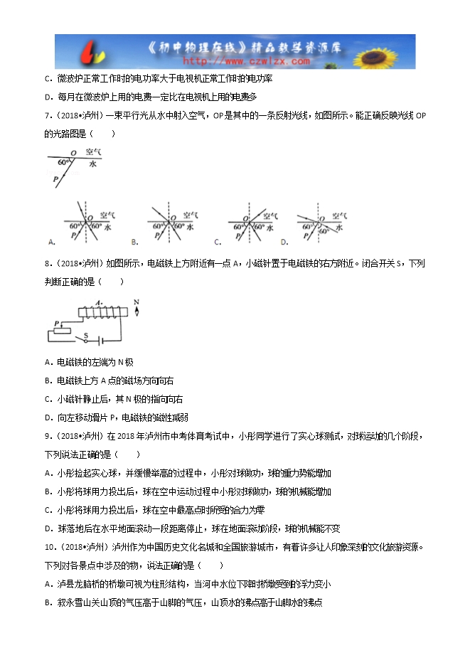 四川省泸州市2018年中考理综(物理部分)试题(word版,解析版)