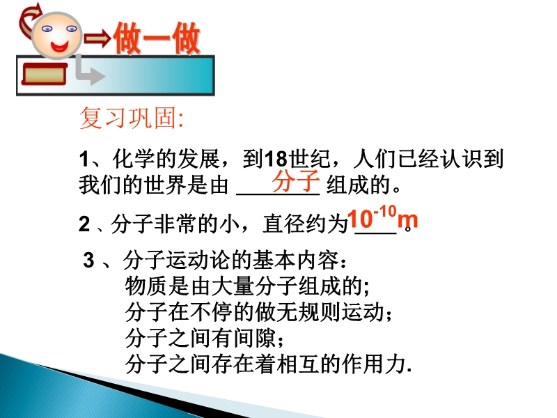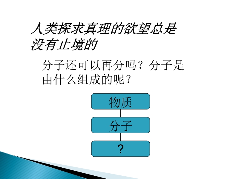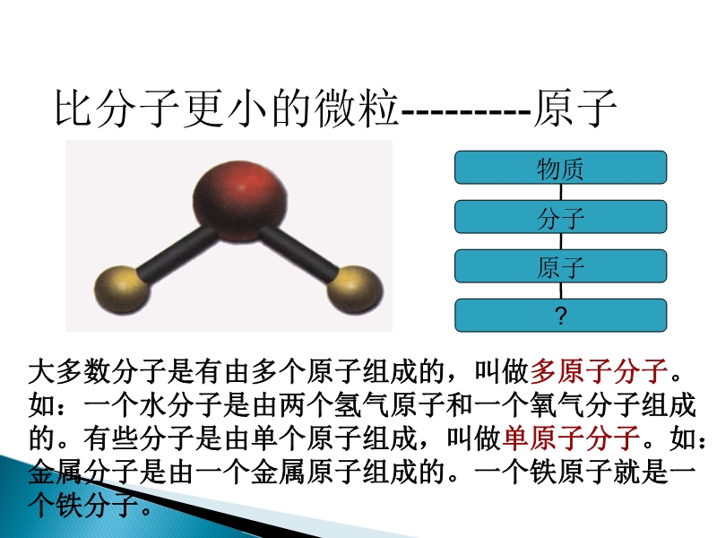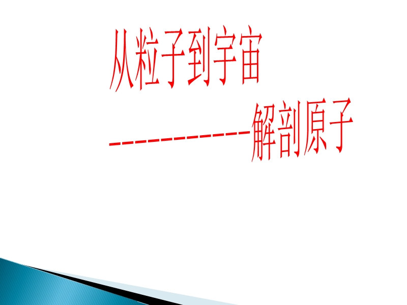 【内容简介】沪粤版八年级物理下册《10.3解剖原子》ppt课件共有38张幻灯片,由学过的分子引入,得出原子的概念,跟随物理学史的发展逐步介绍了电子、原子核、质子、中子、夸克等粒子的发现过程,并附有相关练习。