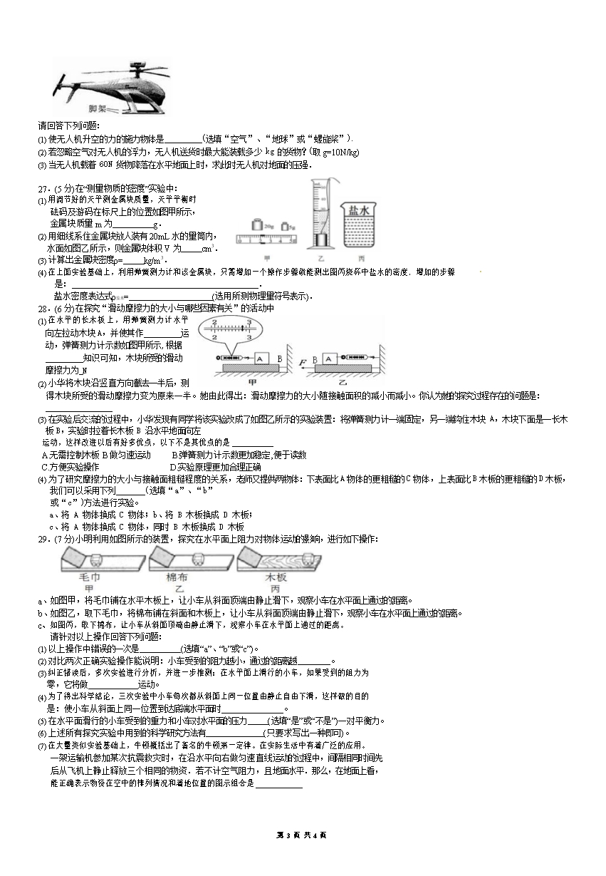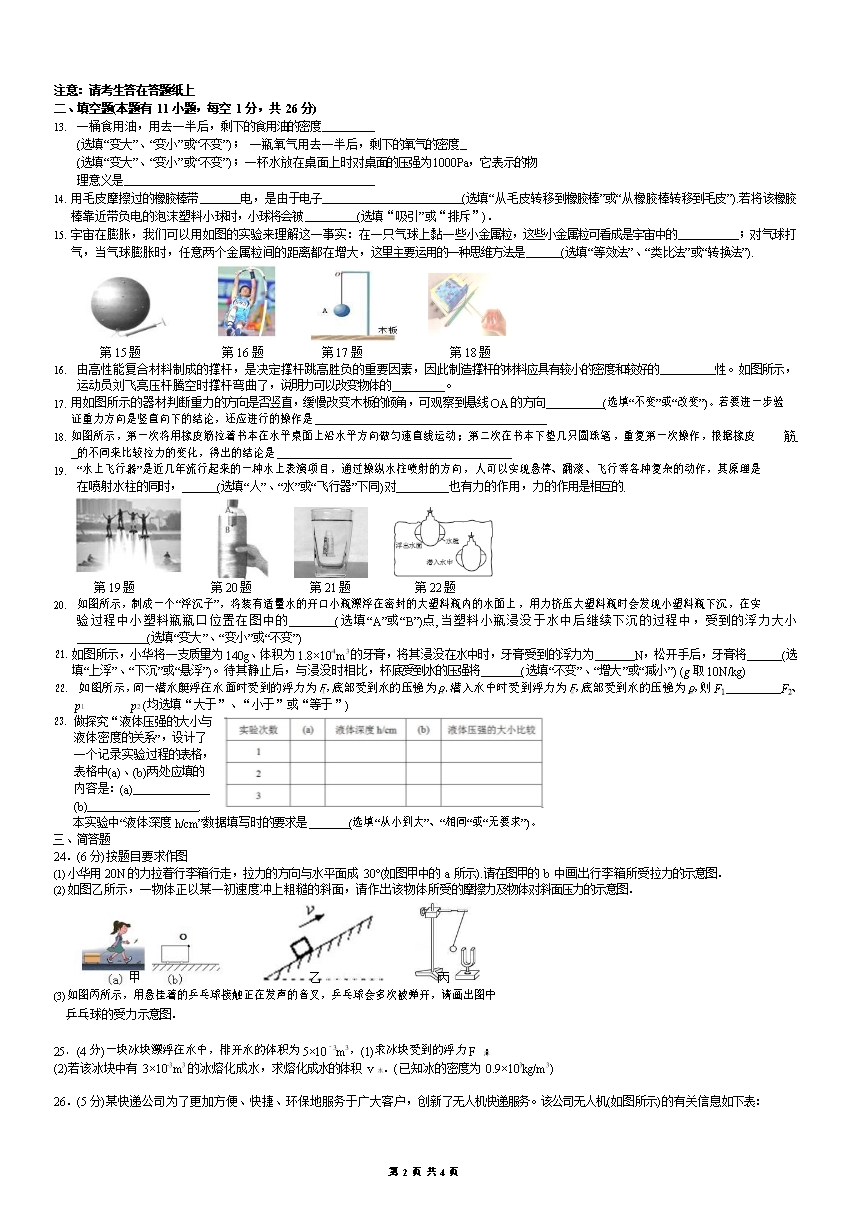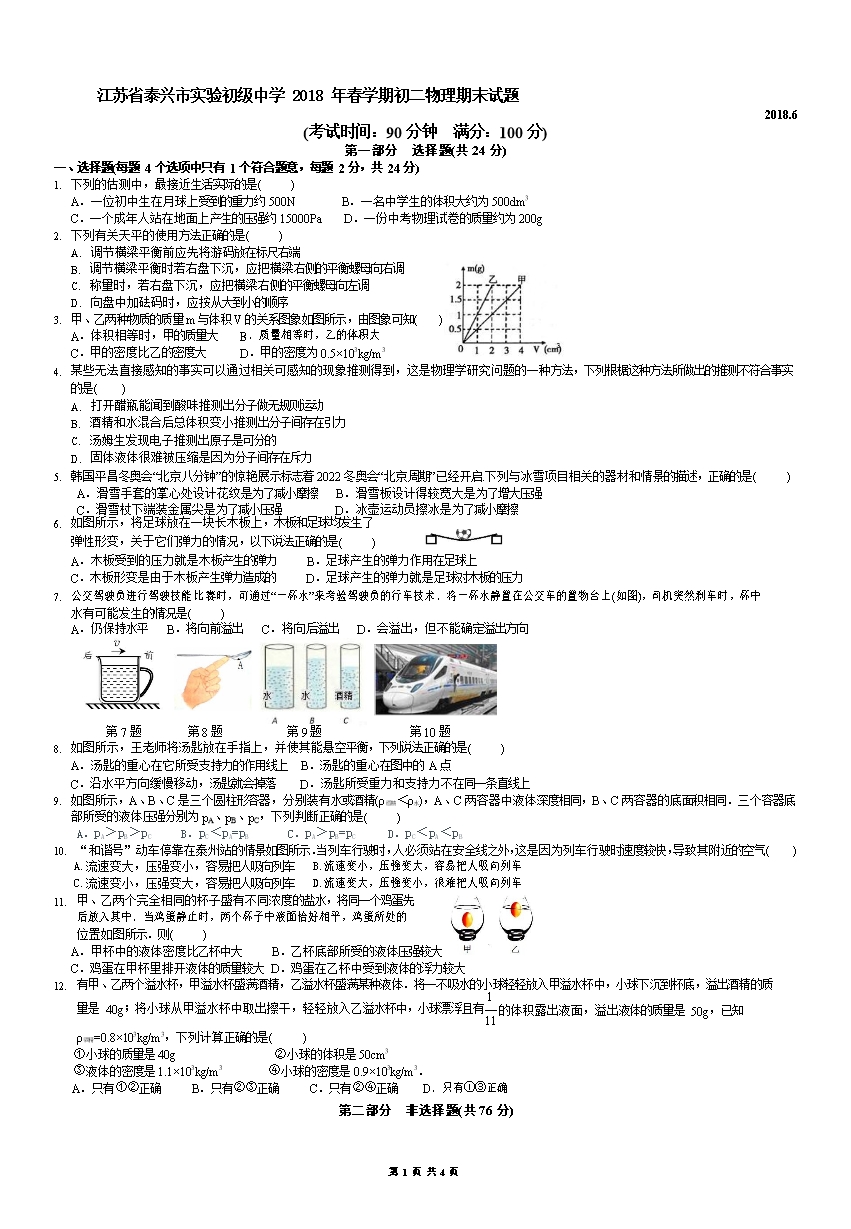 江苏省泰兴市实验初级中学2017-2018学年第二学期初二物理期末考试试题(无答案)