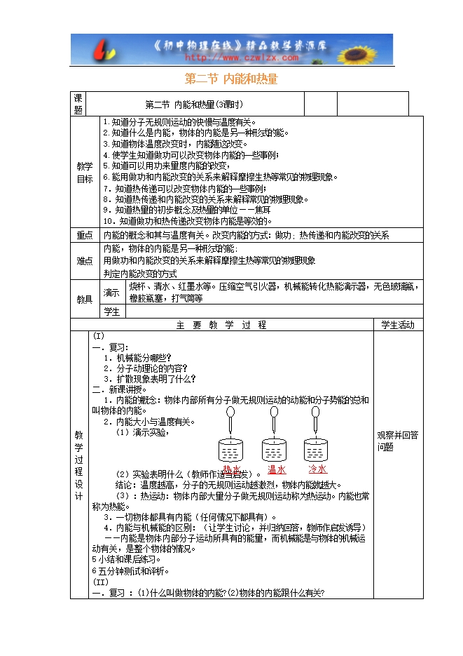 一. 复习引入新课:复习内能的概念,复习中强调物体的内能是能够改变的。通常物体温度的升降,反映出内能的改变。那么一个物体温度的升高除了上节课讲的摩擦生热外还有其他方法吗?
