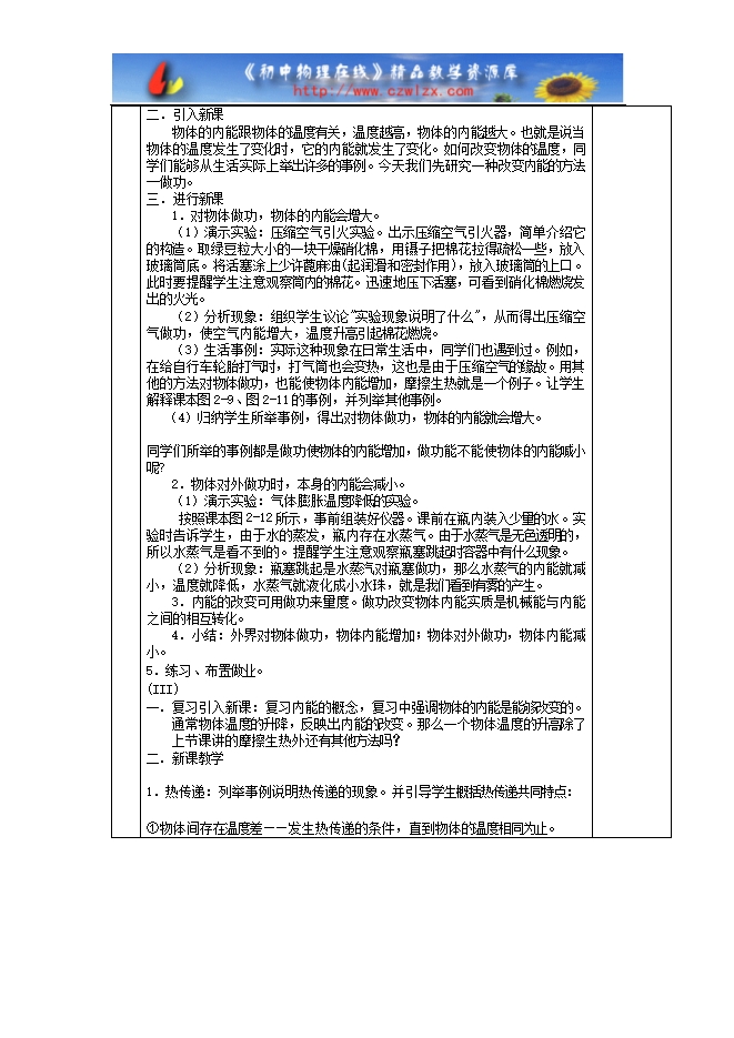 (3)生活事例:实际这种现象在日常生活中,同学们也遇到过。例如,在给自行车轮胎打气时,打气筒也会变热,这也是由于压缩空气的缘故。用其他的方法对物体做功,也能使物体内能增加,摩擦生热就是一个例子。让学生解释课本图2-9、图2-11的事例,并列举其他事例。