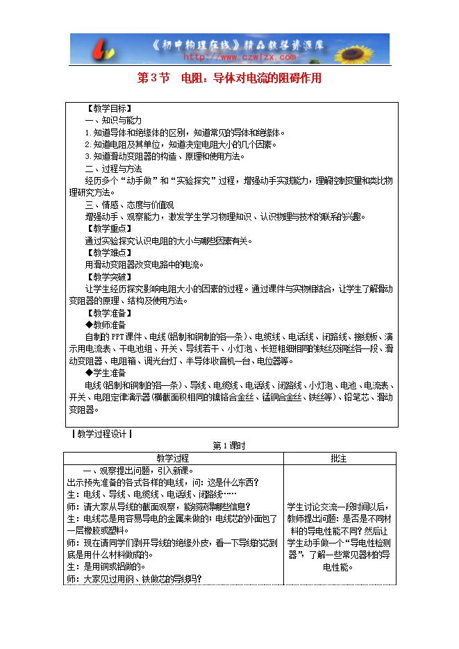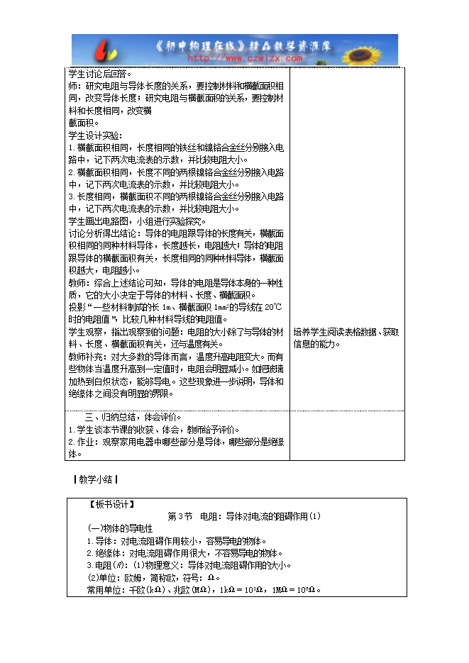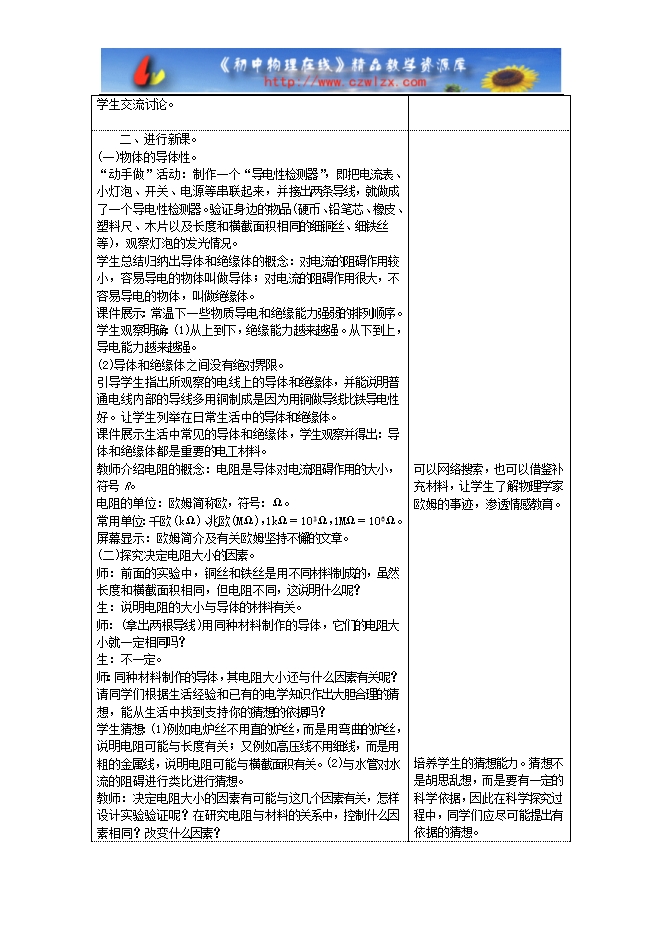 让学生经历探究影响电阻大小的因素的过程。通过课件与实物相结合,让学生了解滑动变阻器的原理、结构及使用方法。