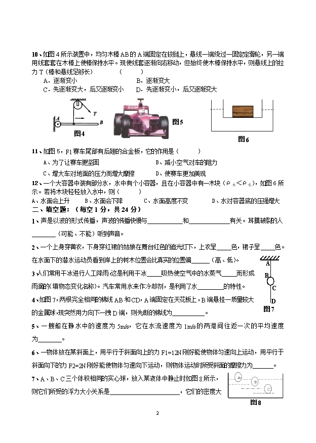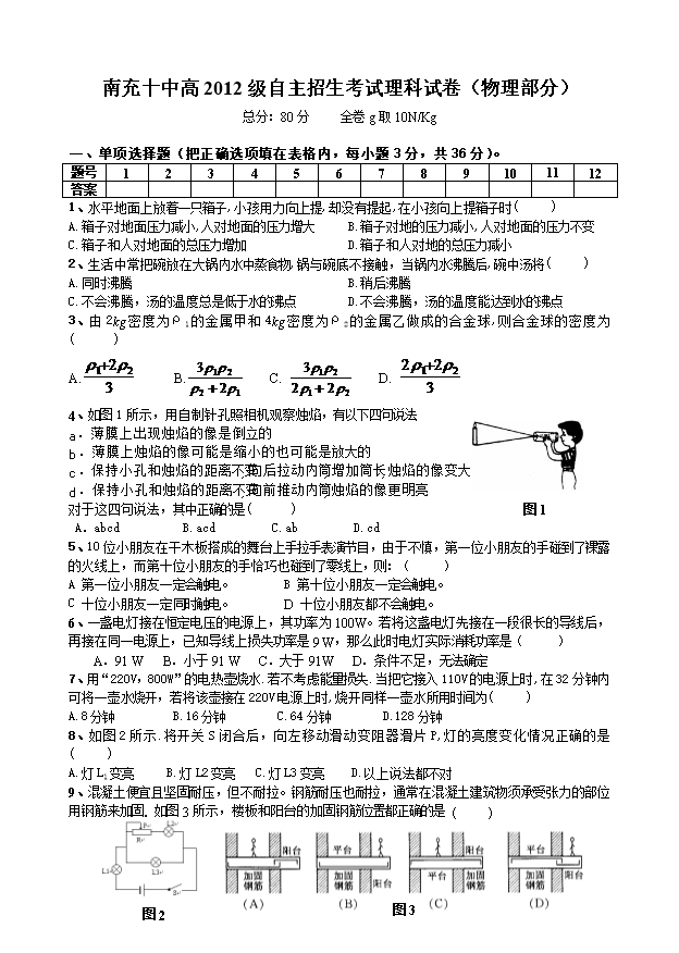 南充十中高2012级自主招生考试理科试卷(物理部分)及答案