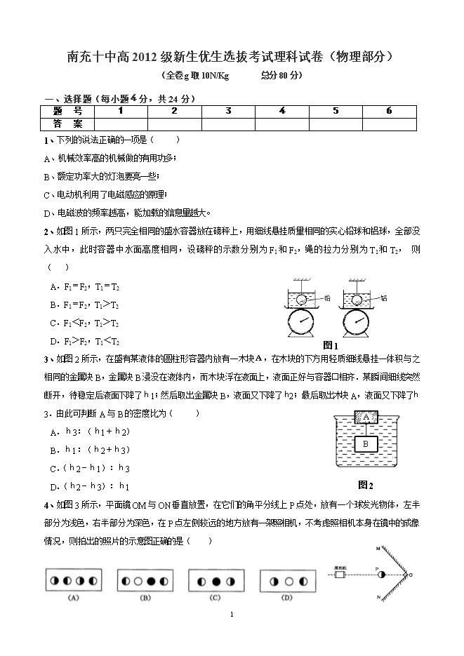 - 4456南充十中高2012级自主招生考试理科试卷(物理部分)及答案