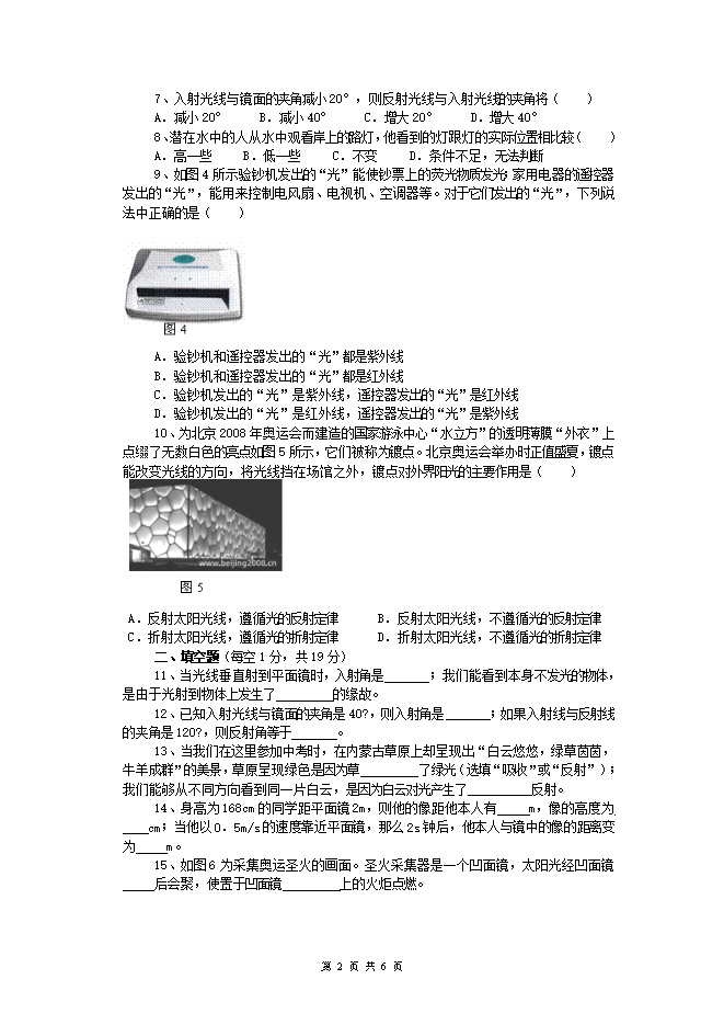 10、为北京2008年奥运会而建造的国家游泳中心“水立方”的透明薄膜“外衣”上点缀了无数白色的亮点如图5所示,它们被称为镀点。北京奥运会举办时正值盛夏,镀点能改变光线的方向,将光线挡在场馆之外,镀点对外界阳光的主要作用是( )