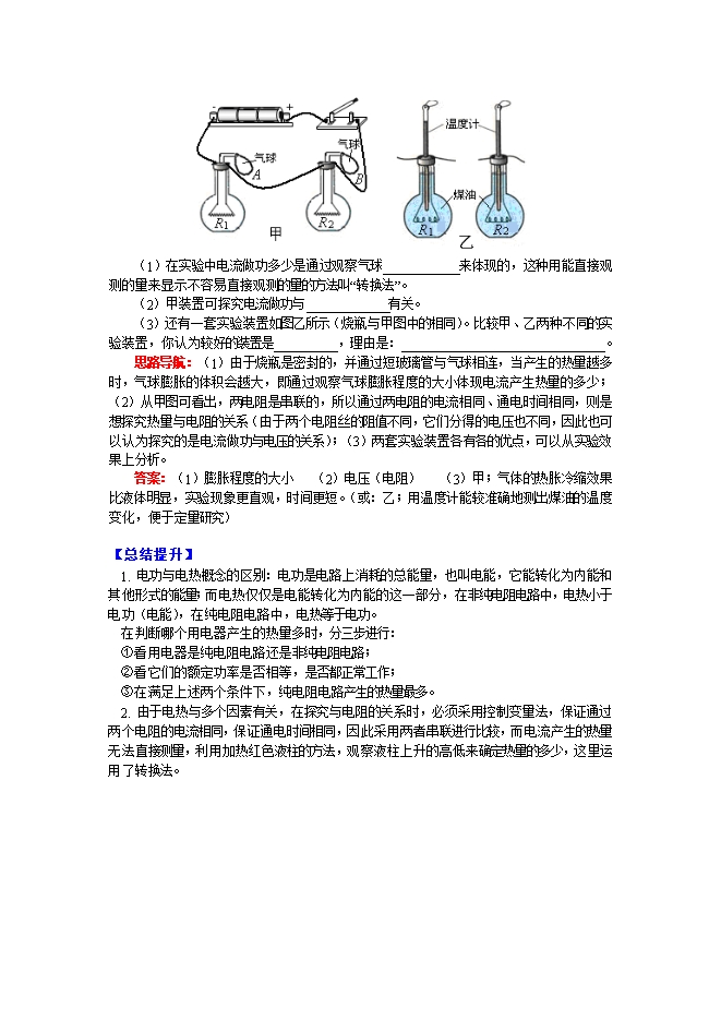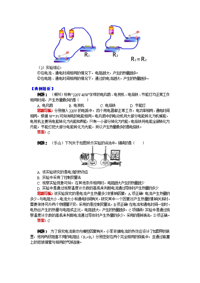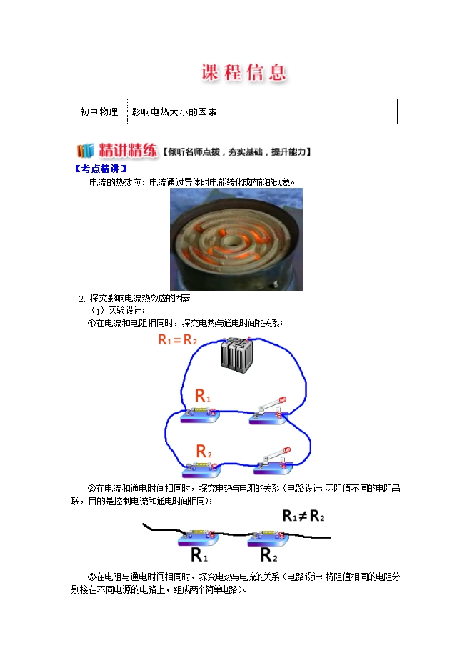 ②在电流和通电时间相同时,探究电热与电阻的关系(电路设计:两阻值不同的电阻串联,目的是控制电流和通电时间相同);