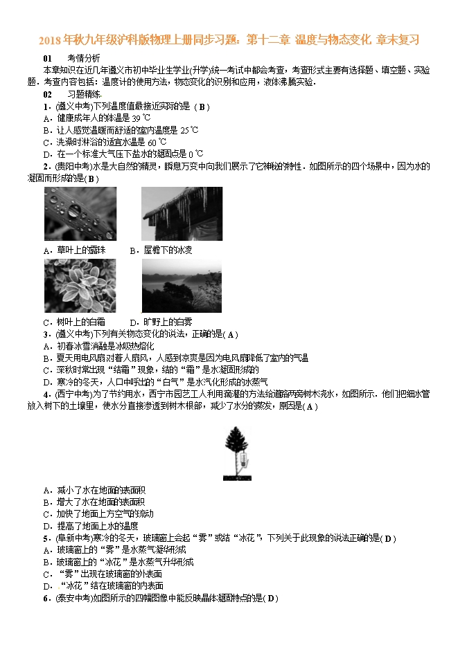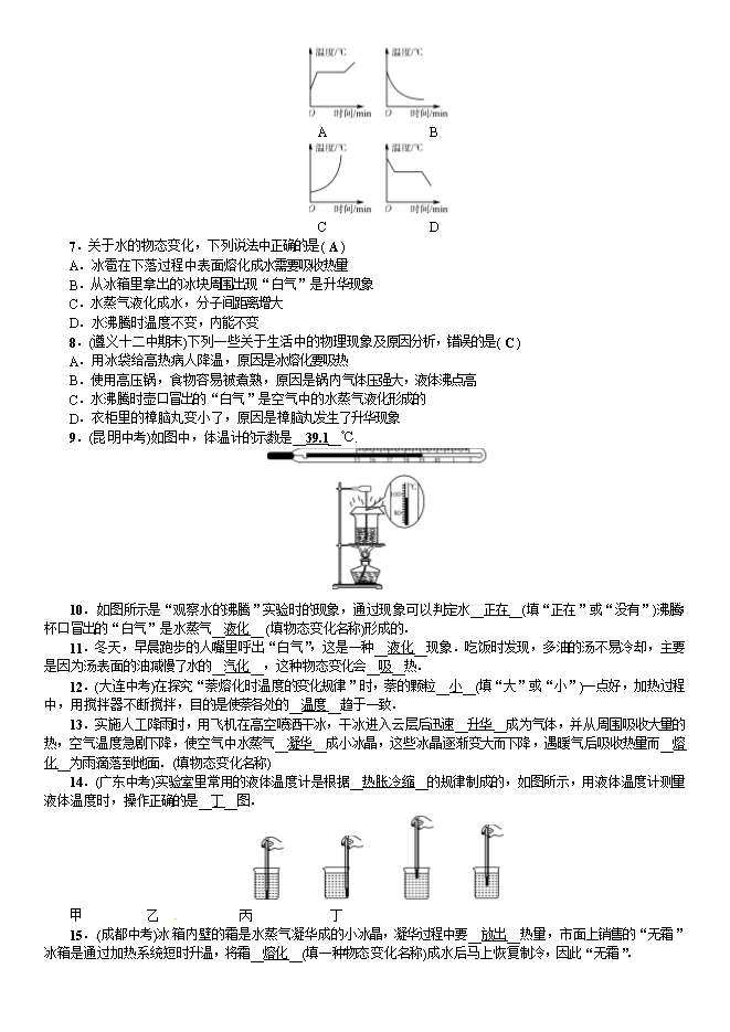本章知识在近几年遵义市初中毕业生学业(升学)统一考试中都会考查,考查形式主要有选择题、填空题、实验题.考查内容包括:温度计的使用方法,物态变化的识别和应用,液体沸腾实验.