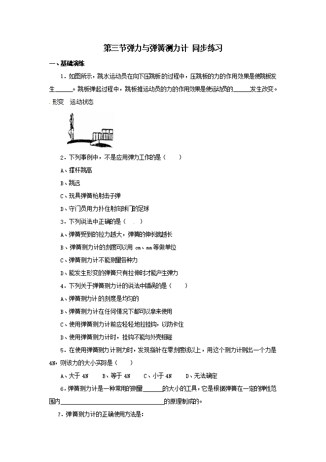 总结:任何物体只要发生形变就一定会产生弹力,日常生活中经常遇到的支持物的压力、绳的拉力等,其实质都是弹力。弹力在生活中有广泛的应用,我们用的自动铅笔和一些圆珠笔里面要利用弹簧的弹力。跳水运动中1m板和3m板的跳水都是利用了弹力。射箭运动员利用了弓的弹力才能把箭射出去。撑杆跳高运动员利用了杆形变后产生的弹力。体操比赛中。跳马运动员利用踏板的弹力才能腾空,跳远运动员也要利用踏板的弹力。自行车的支架上也有利用弹簧的弹力。拉力器也是利用了弹簧的弹力。