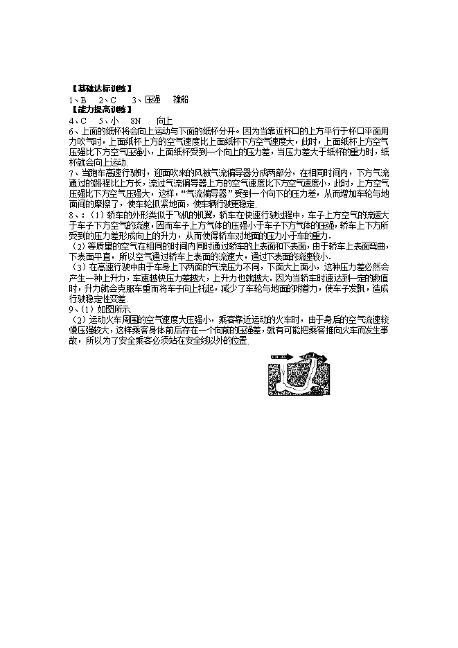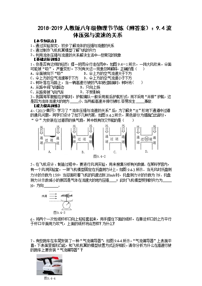 2018-2019人教版八年级物理节节练(附答案):9.4流体压强与流速的关系