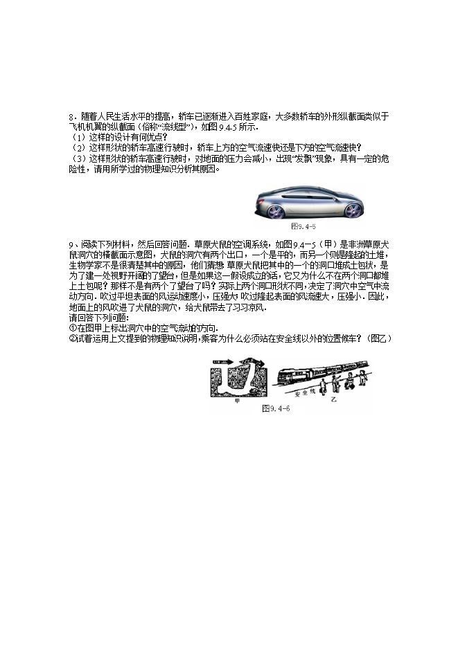 7、有些跑车在车尾安装了一种“气流偏导器”,如图9.4-4所示,“气流偏导器”上表面平直,下表面呈弧形凸起,和飞机机翼的模型放置方式正好相反,请你分析为什么在高速行驶的跑车上要安装“气流偏导器”?