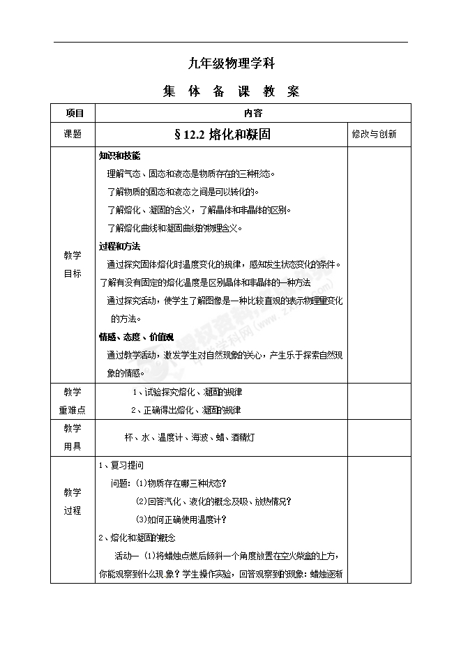 (沪科版)安徽省无为县第二中学物理九年级集体备课教案:12.2熔化和凝固