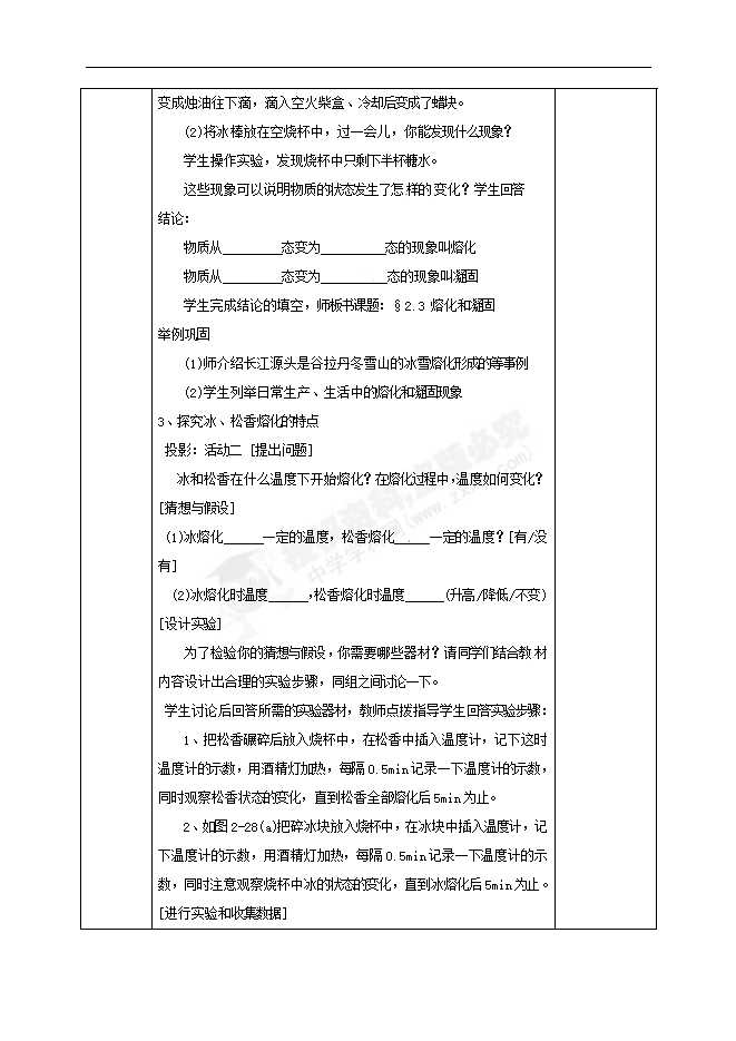 活动一 (1)将蜡烛点燃后倾斜一个角度放置在空火柴盒的上方,你能观察到什么现象?学生操作实验,回答观察到的现象:蜡烛逐渐变成烛油往下滴,滴入空火柴盒、冷却后变成了蜡块。