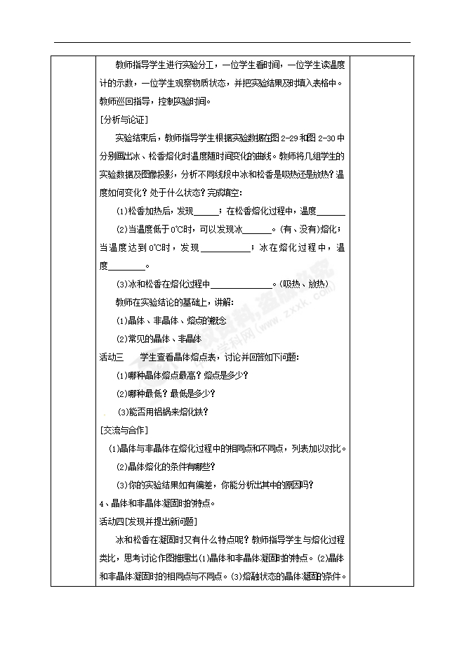 实验结束后,教师指导学生根据实验数据在图2-29和图2-30中分别画出冰、松香熔化时温度随时间变化的曲线。教师将几组学生的实验数据及图像投影,分析不同线段中冰和松香是吸热还是放热?温度如何变化?处于什么状态?完成填空: