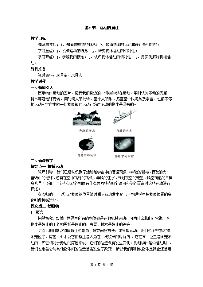 2018-2019新版人教版八年级物理教学设计:1.2运动的描述(附教学反思)