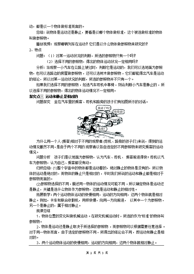 知识与技能:1.知道参照物的概念;2.知道物体的运动和静止是相对的。