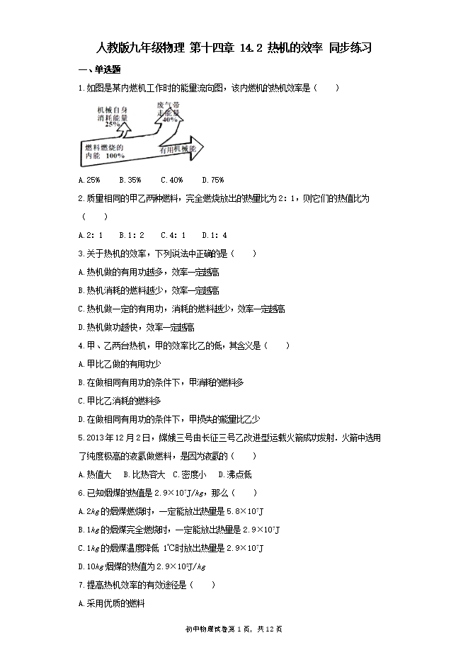- 732023-2024人教版九年级物理同步练:《14.2热机的效率》同步练2(附答案)
