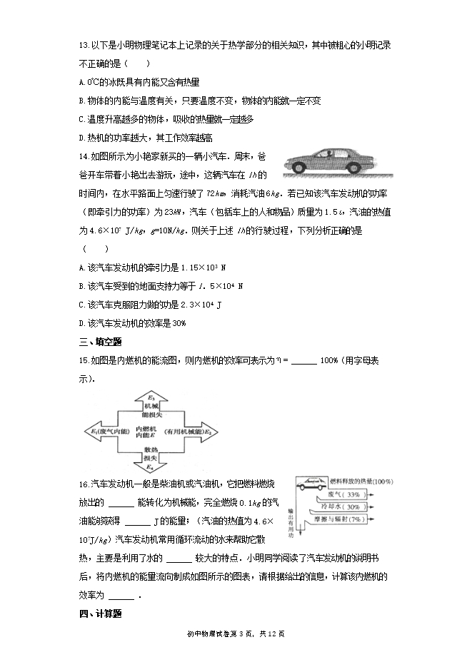 D.蒸汽机、汽油机和柴油机的热机效率分别是η1、η2和η3,则有η1<η2<η3