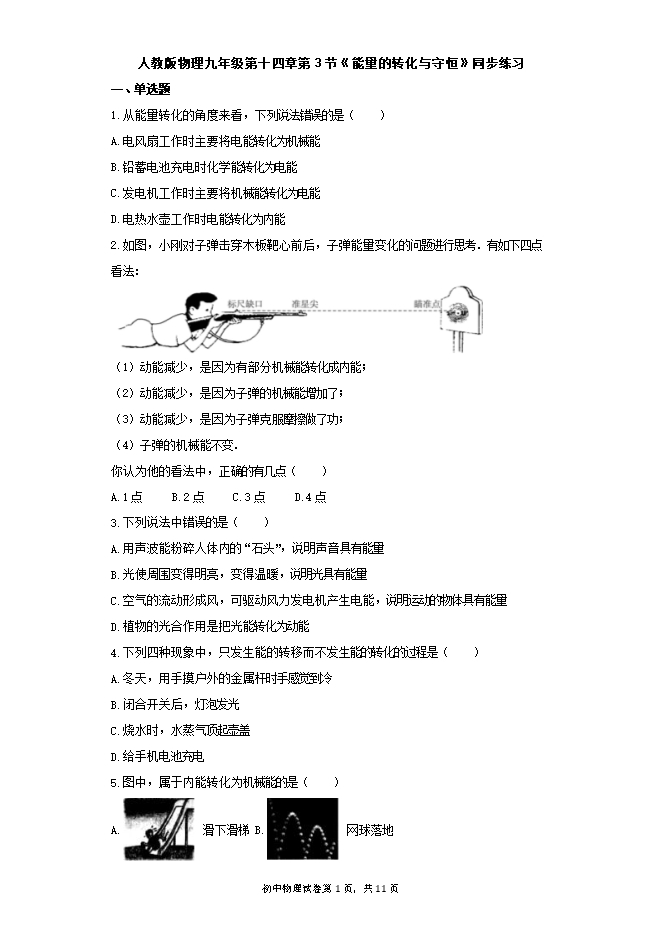 2018秋人教版九年级物理同步练习及解析(一):14.3能量的转化与守恒