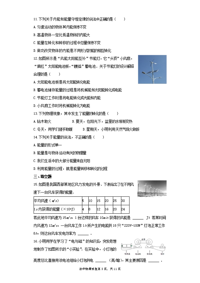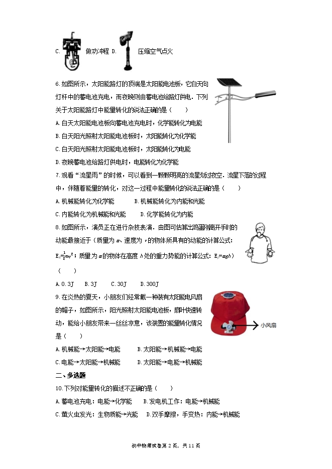 9.在炎热的夏天,小朋友们经常戴一种装有太阳能电风扇的帽子,如图所示,阳光照射太阳能电池板,扇叶快速转动,能给小朋友带来一丝丝凉意,该装置的能量转化情况是( )