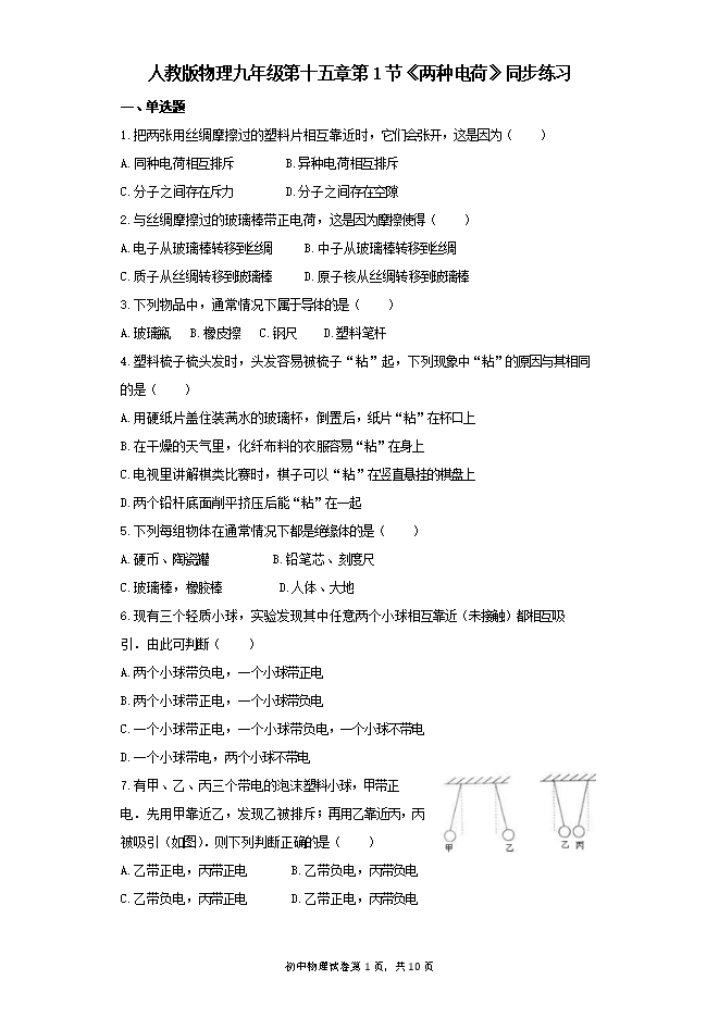7.有甲、乙、丙三个带电的泡沫塑料小球,甲带正电.先用甲靠近乙,发现乙被排斥;再用乙靠近丙,丙被吸引(如图).则下列判断正确的是( )