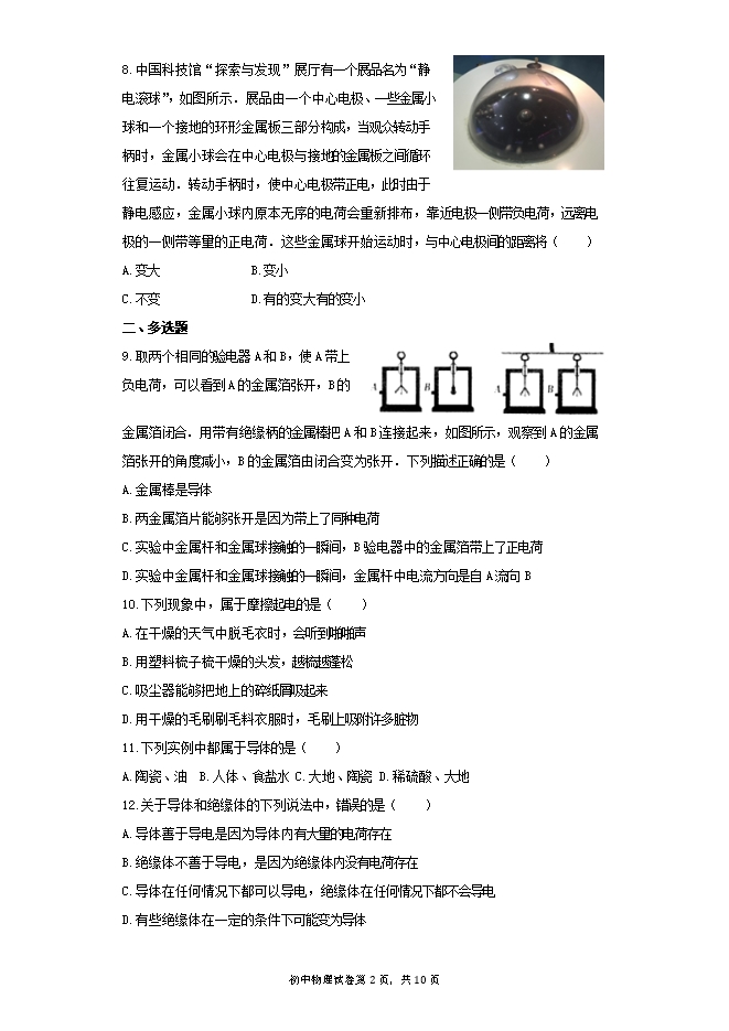 8.中国科技馆“探索与发现”展厅有一个展品名为“静电滚球”,如图所示.展品由一个中心电极、一些金属小球和一个接地的环形金属板三部分构成,当观众转动手柄时,金属小球会在中心电极与接地的金属板之间循环往复运动.转动手柄时,使中心电极带正电,此时由于静电感应,金属小球内原本无序的电荷会重新排布,靠近电极一侧带负电荷,远离电极的一侧带等量的正电荷.这些金属球开始运动时,与中心电极间的距离将( )