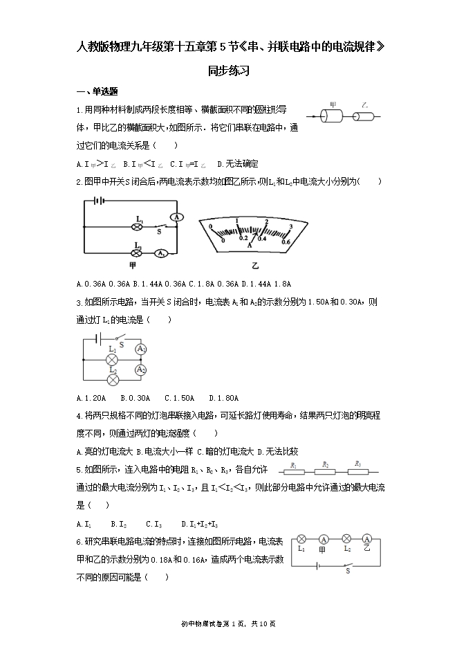 1.用同种材料制成两段长度相等、横截面积不同的圆柱形导体,甲比乙的横截面积大,如图所示.将它们串联在电路中,通过它们的电流关系是( )