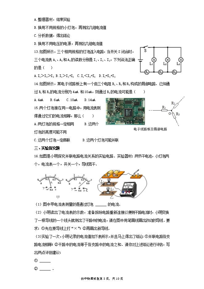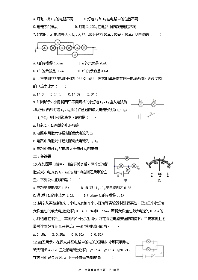 2.图甲中开关S闭合后,两电流表示数均如图乙所示,则L1和L2中电流大小分别为( )