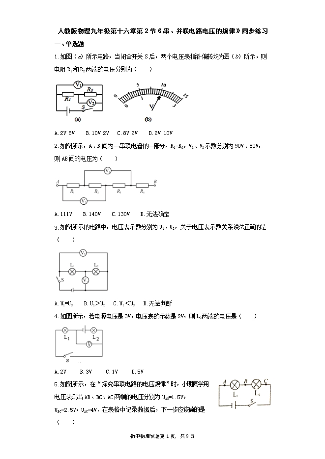 - 692023-2024人教版九年级物理同步练:《16.2串、并联电路中电压的规律》同步练1(附答案)