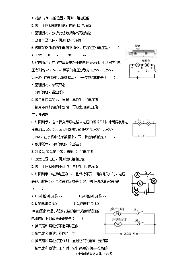 8.如图所示,在“探究串联电路中电压的规律”时,小芳同学用电压表测出ab、bc、ac两端的电压分别为Uab=3V,Ubc=3V,Uac=6V.在表格中记录数据后,下一步应该做的是( )
