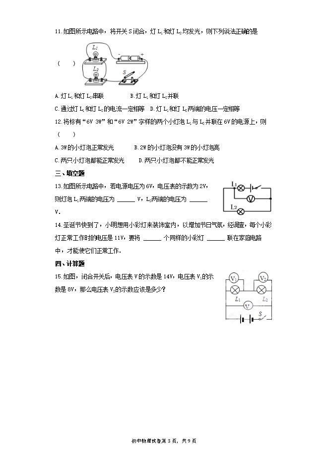 3.如图所示的电路中,电压表示数分别为U1、U2,关于电压表示数关系说法正确的是( )
