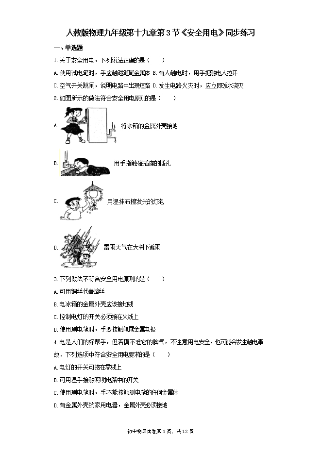 2018秋人教版九年级物理同步练习及解析(一):19.3安全用电