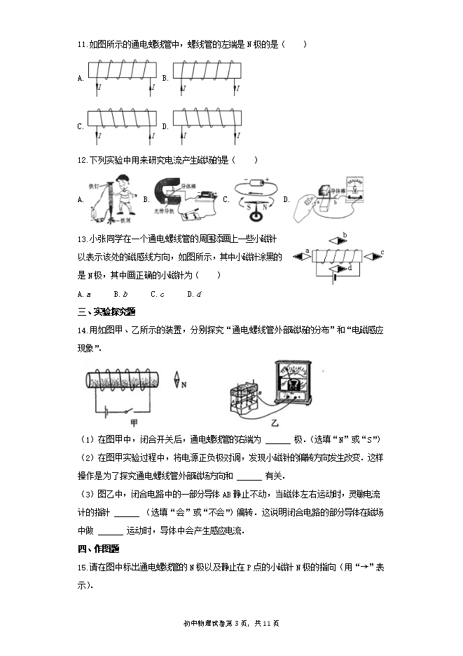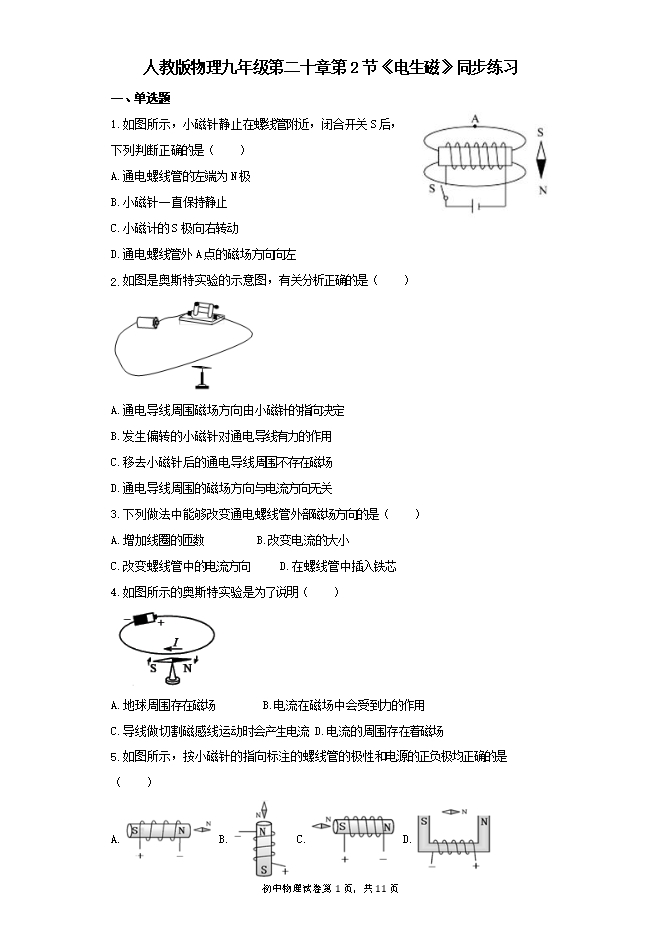 2018秋人教版九年级物理同步练习及解析(一):20.2电生磁