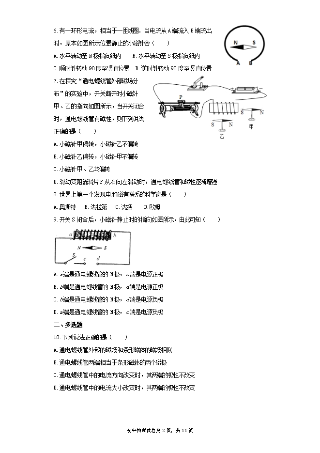 9.开关S闭合后,小磁针静止时的指向如图所示,由此可知( )