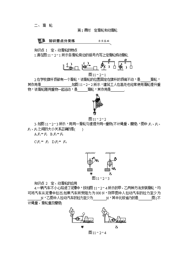 2.在学校旗杆顶部有一个滑轮,该滑轮的位置固定在旗杆的顶端不动,是______滑轮,其作用是__________________.如图11-2-2所示,建筑工人在高处也经常使用滑轮提升重物,该滑轮随同重物一起运动,是______滑轮,其作用是________.