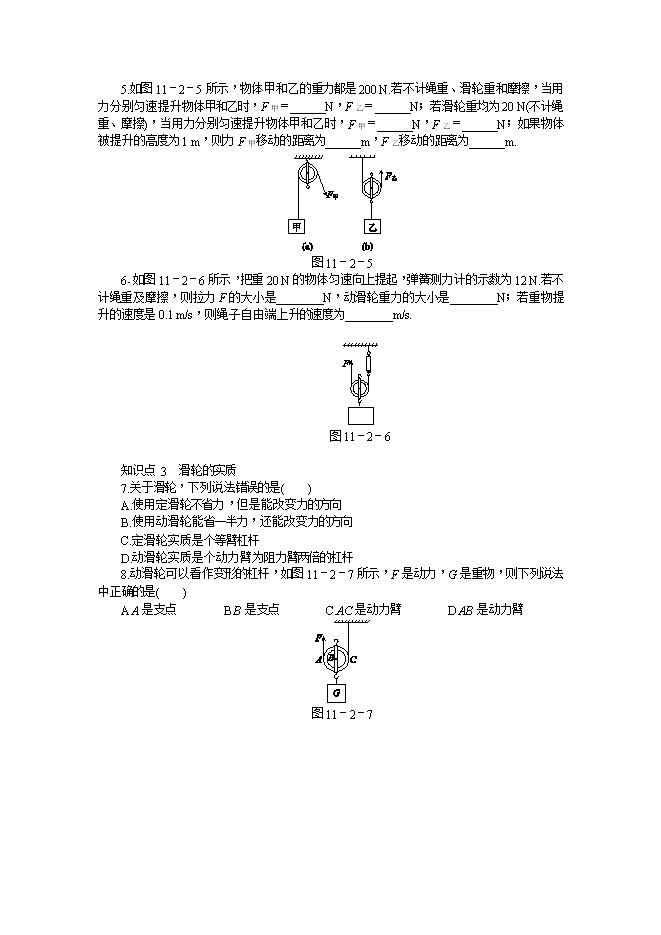 5.如图11-2-5所示,物体甲和乙的重力都是200 N.若不计绳重、滑轮重和摩擦,当用力分别匀速提升物体甲和乙时,F甲=______N,F乙=______N;若滑轮重均为20 N(不计绳重、摩擦),当用力分别匀速提升物体甲和乙时,F甲=______N,F乙=______N;如果物体被提升的高度为1 m,则力F甲移动的距离为______m,F乙移动的距离为______m.