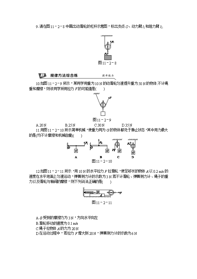 6.如图11-2-6所示,把重20 N的物体匀速向上提起,弹簧测力计的示数为12 N.若不计绳重及摩擦,则拉力F的大小是________N,动滑轮重力的大小是________N;若重物提升的速度是0.1 m/s,则绳子自由端上升的速度为________m/s.