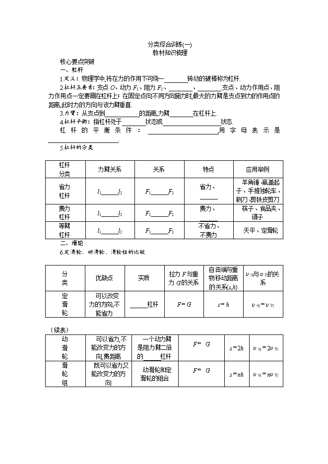 2018年秋苏科版九年级物理上册同步练习:第十一章 简单机械和功 分类综合训练(一)