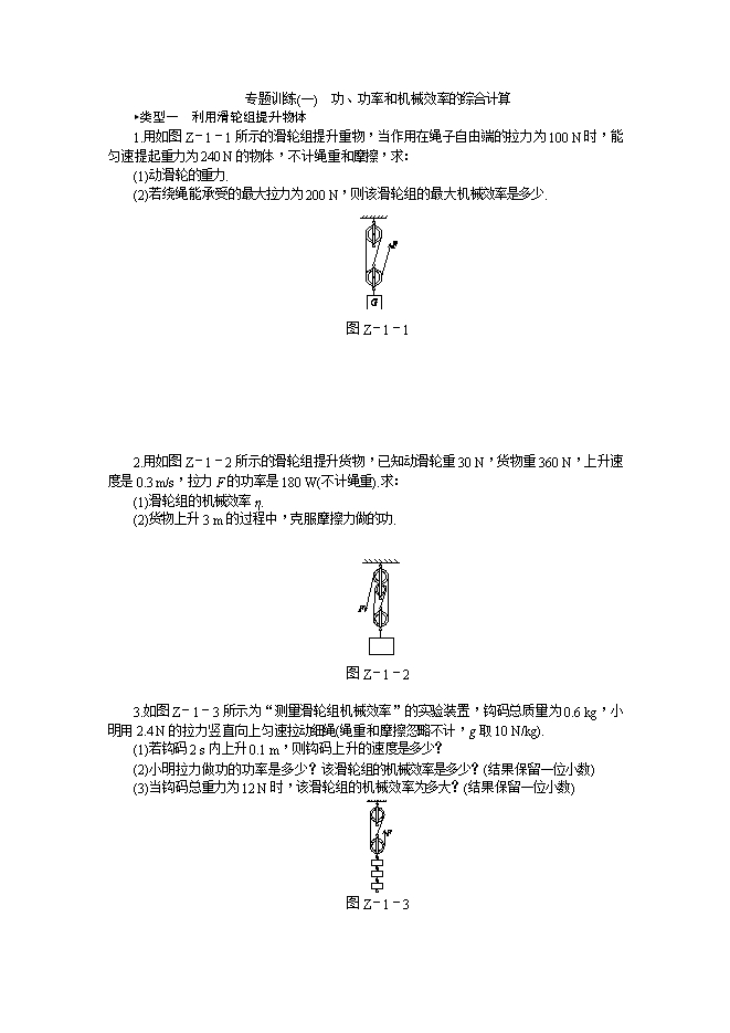 1.用如图Z-1-1所示的滑轮组提升重物,当作用在绳子自由端的拉力为100 N时,能匀速提起重力为240 N的物体,不计绳重和摩擦,求: