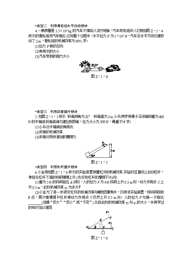 4.一辆质量是3.5×103 kg的汽车不慎陷入泥泞地面,汽车司机组织人们用如图Z-1-4所示的滑轮组将汽车拖出.已知整个过程中,水平拉力F为1×103 N,汽车沿水平方向匀速移动了2 m,滑轮组的机械效率为90%.求:
