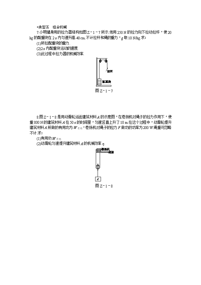 2.用如图Z-1-2所示的滑轮组提升货物,已知动滑轮重30 N,货物重360 N,上升速度是0.3 m/s,拉力F的功率是180 W(不计绳重).求: