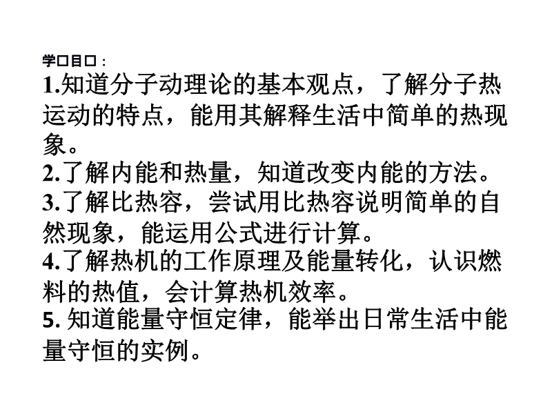 【内容简介】人教版九年级物理上册课件:《第十三、四章 内能 内能的利用》PPT复习课件,共有21张幻灯片。课件按照本章的知识结构采用讲练结合,然后引导学生详细地回顾了重点内容,并进行适时练习,将练习与知识的学习相结合,边学边练,能提高学生分析问题和解决问题的能力
