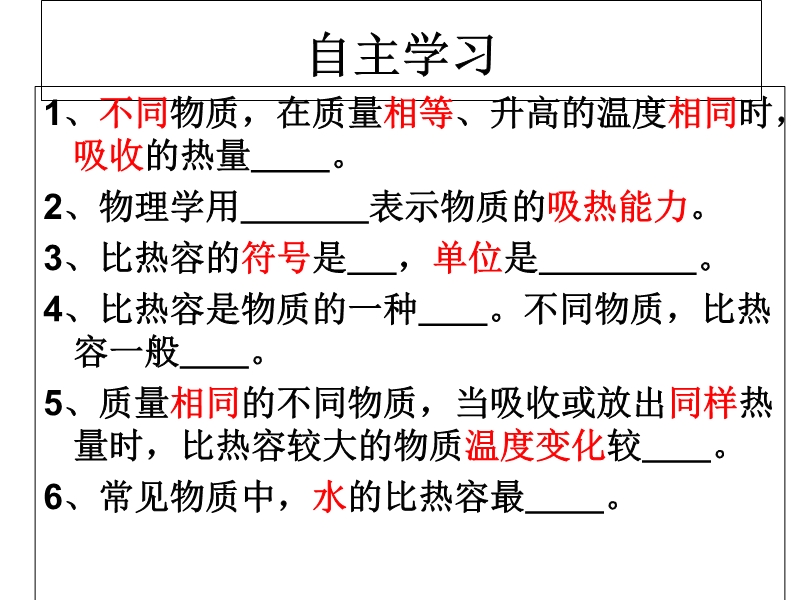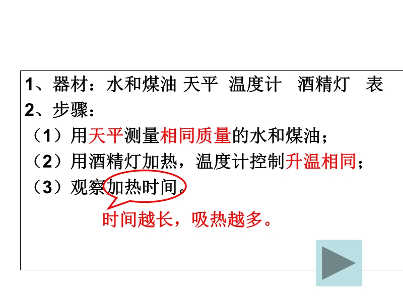 【内容简介】人教版九年级物理全册《13.3比热容》PPT课件,共由26张幻灯片组,课件主要引导学生学习了比热容的概念、意义、单位、计算方法及应用等,课件重点引导学生通过实验探究研究了物质的属性比热容。课件还引导学生利用比热容的知识去解释生活中的一些现象。