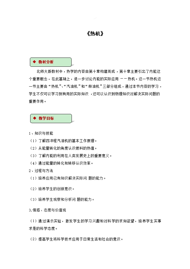 【内容简介】北师大版教材中,热学的内容由第十章构建而成,第十章主要引出了内能这个重要概念,在此基础上,进一步讨论内能的实际应用——热机。这一节热机这一节主要由“热机”、“汽油机”和“柴油机”三部分组成,通过本节内容的学习,学生不仅可以学习到有用的实际知识,还可以认识到物理知识对解决实际问题的重要作用。
